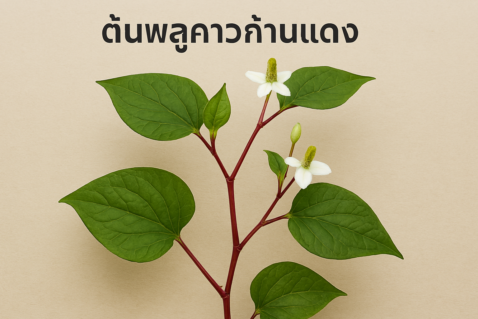 ภาพนี้แสดงลักษณะเด่นของต้นพลูคาวสายพันธุ์ก้านแดงอย่างชัดเจน — ใบรูปหัวใจสีเขียวเข้มมันเงา ก้านสีแดงสดเลื้อยขึ้นจากดิน และดอกสีขาวเล็กๆ ที่ปลายยอด ดูสดชื่นและมีชีวิตชีวา เหมาะสำหรับใช้ในงานให้ความรู้ด้านสมุนไพรหรือการออกแบบผลิตภัณฑ์สุขภาพ